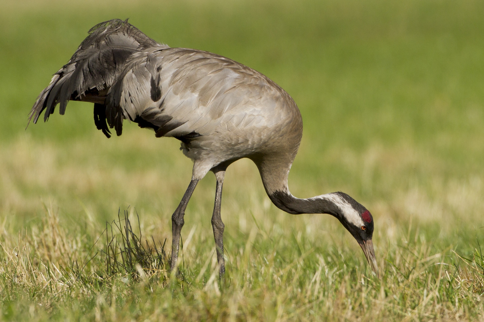 Een foeragerende Kraanvogel in pas gemaaid en bemest weiland ,,,