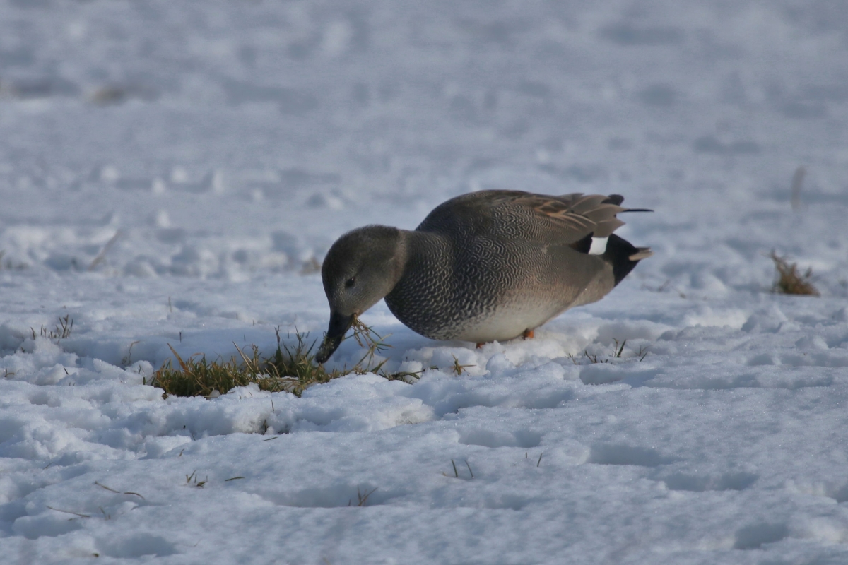 Het is zaterdag 11 februari, de weilanden zijn met een laag sneeuw bedekt. De eenden spitten net zo lang totdat ze een hapje gras te pakken hebben.
