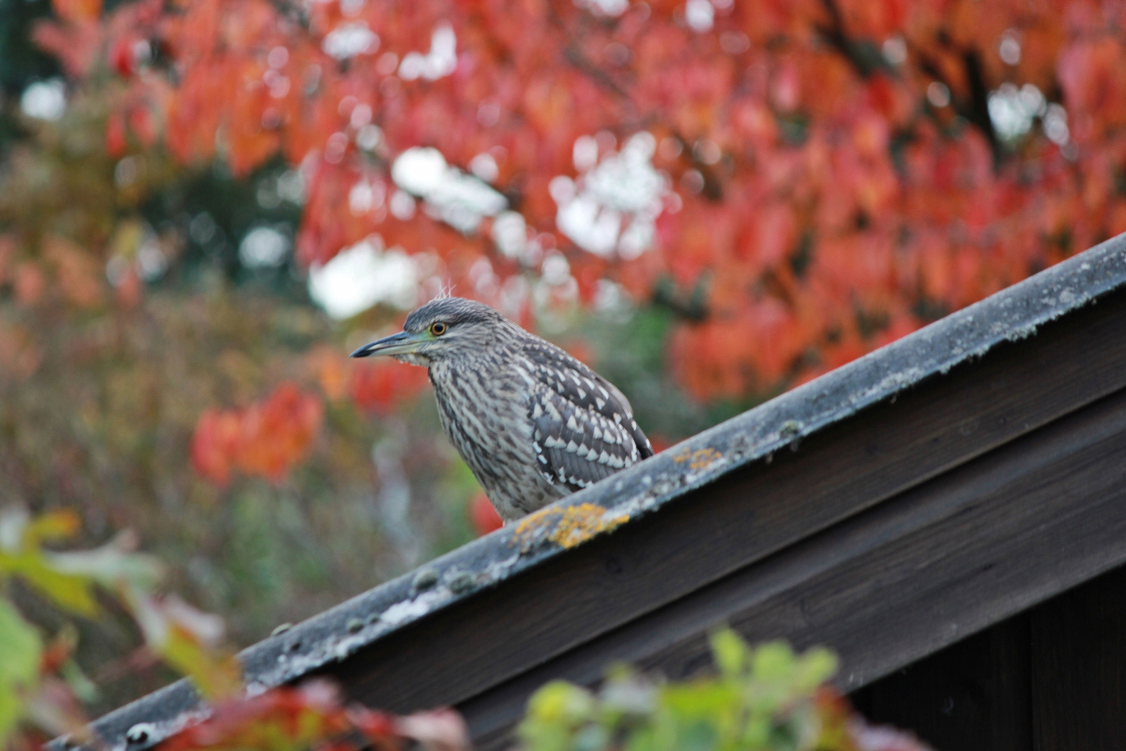 Ik dacht eerst "een roerdomp bij mijn vijver". Dat is bijzonder. De vogel schrok van mij en ging vervolgens op het dak van ons tuinhuisje zitten en wachten tot ik weer weg was.