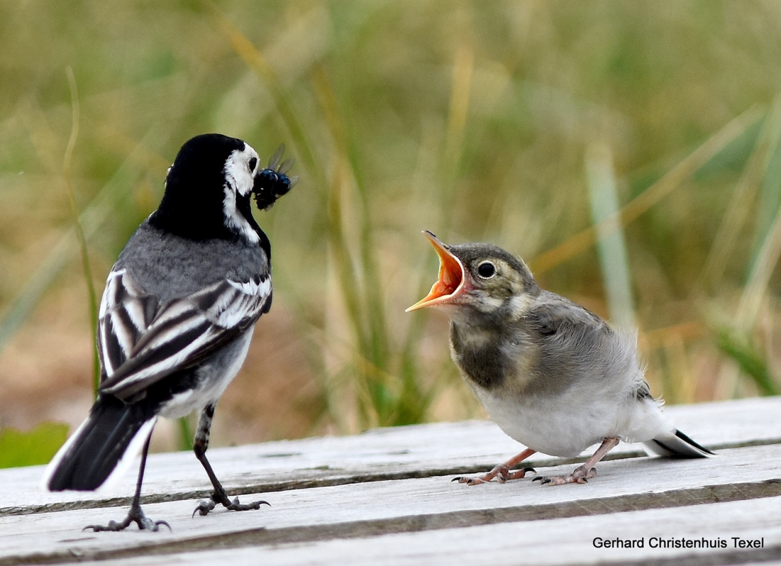 Kwikstaart voert Jong in razend tempo . Paal 12 Texel .