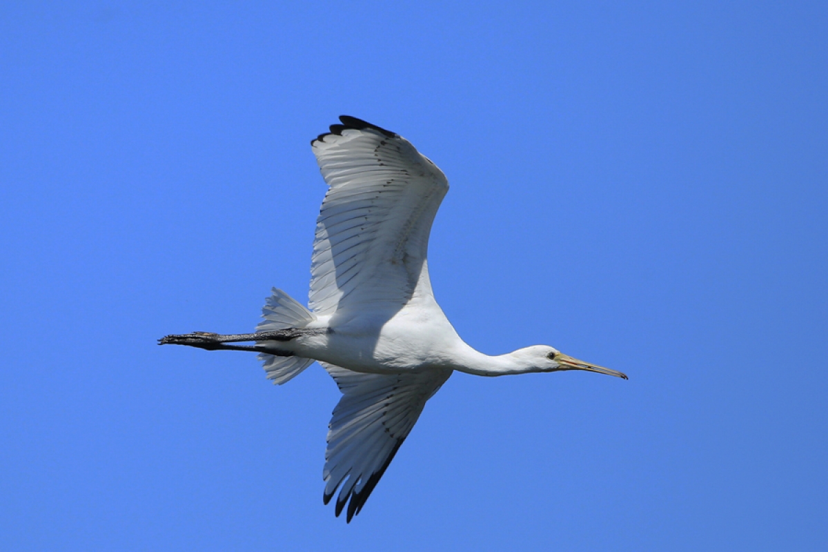 Een juveniele Lepelaar kun je o.a. herkennen aan de lengte en kleur van de snavel en aan de zwarte vleugeltoppen... Dit exemplaar vliegt close voorbij ...