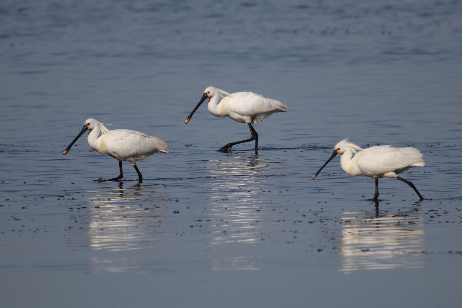 In de Groene Jonker was een grote groep Lepelaars aan het vissen met Aalscholvers. Drie ervan splitste zich af en kwamen wat dichterbij.