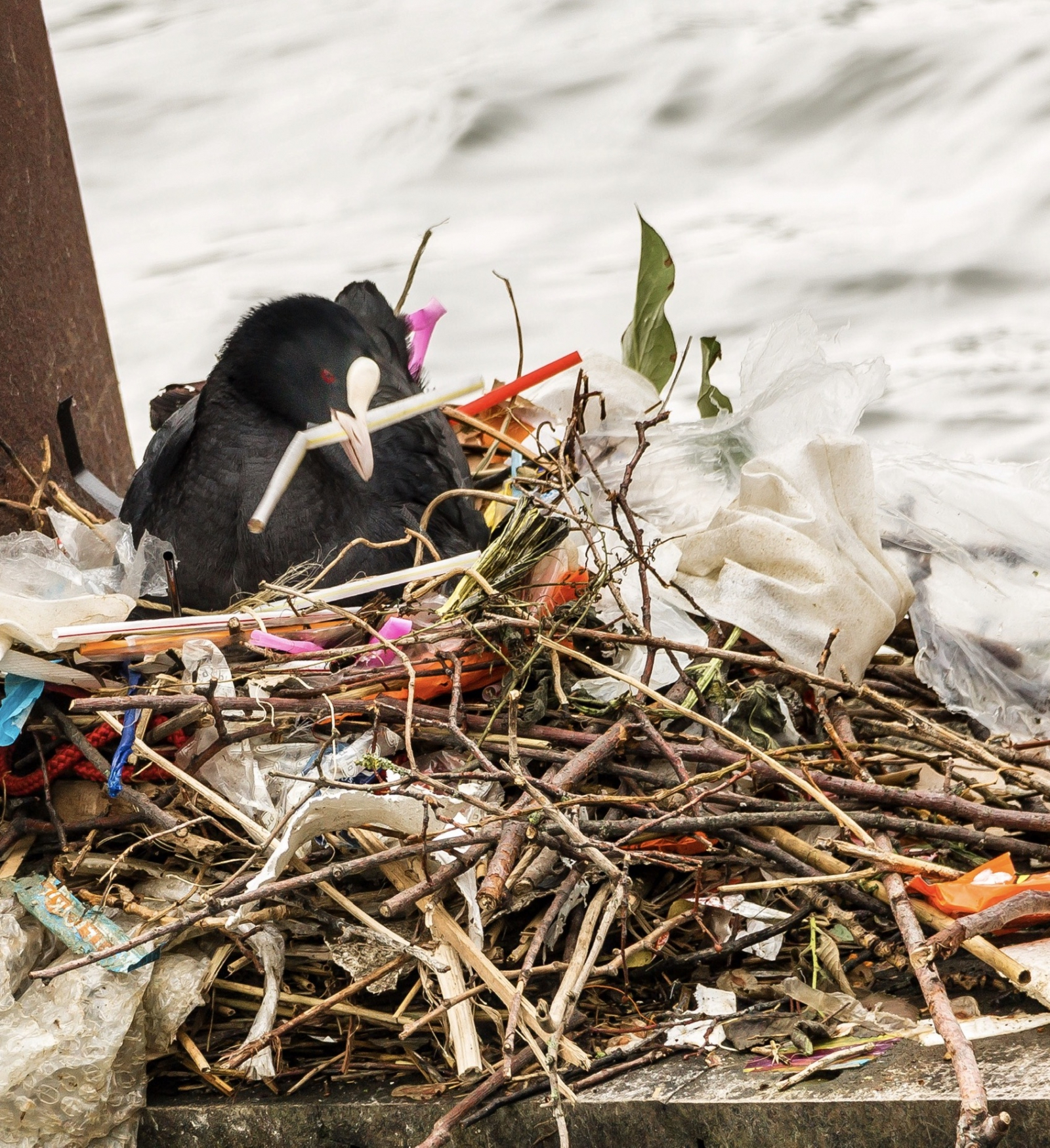 Deze meerkoet is slachtoffer van ons milieu..onder een brug in Amsterdam heeft deze meerkoet een nest gemaakt van rotzooi dat wij als mens weggooien ..