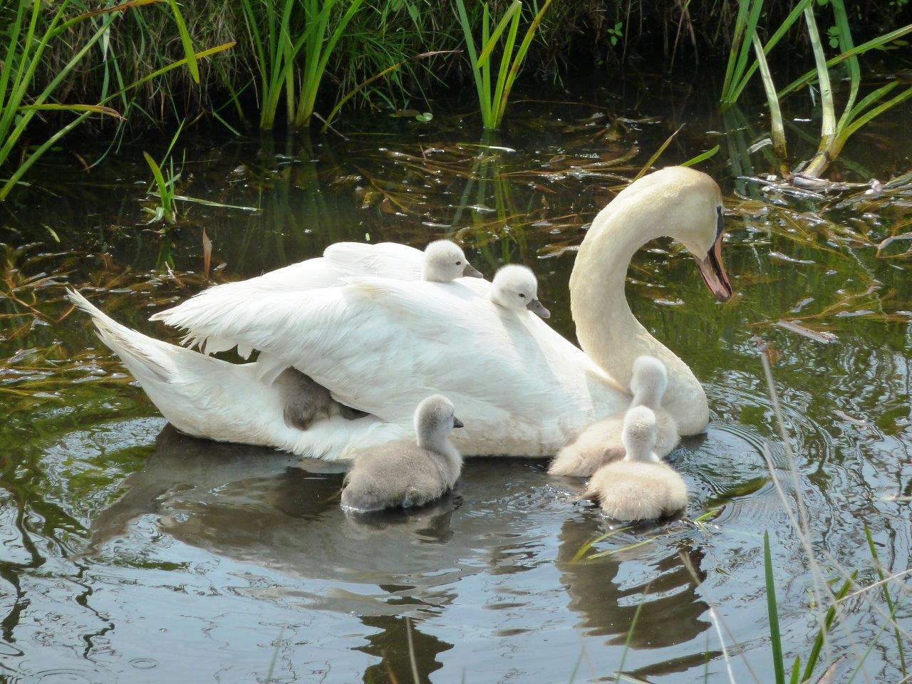 Zwaan met jonkies op de rug en om haar heen. Ze fungeert even als watertaxi voor haar jonkies.
