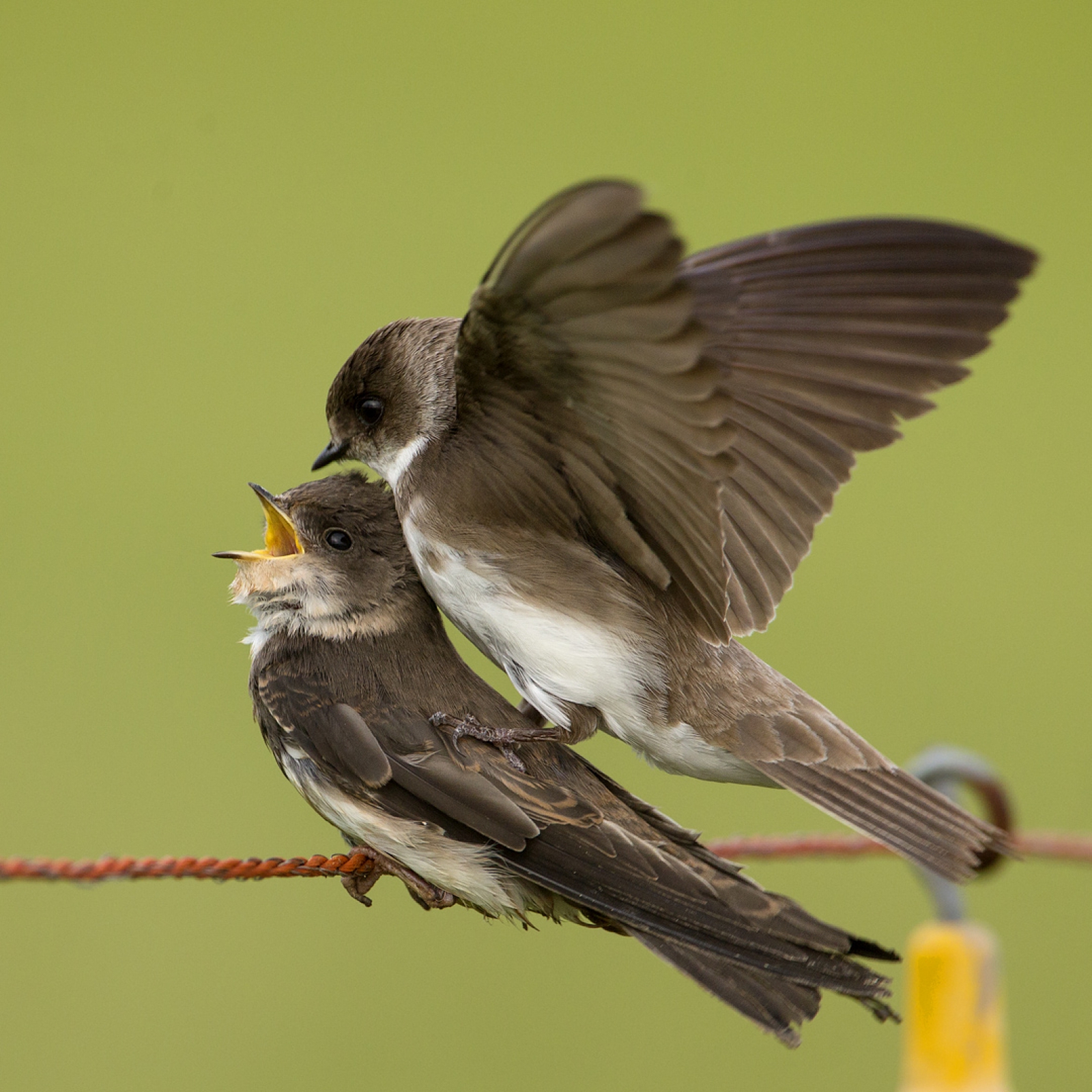 Twee jonge Oeverzwaluwen zijn aan het dollen op een weidedraad ...