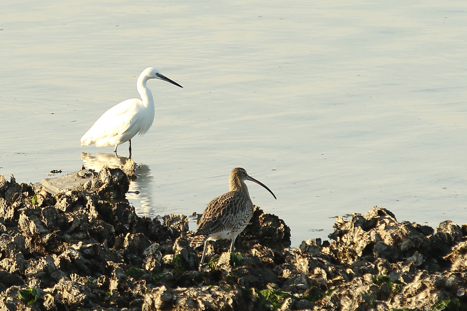 De kleine zilverreiger kreeg onverwachts bezoek van een wulp.... Gelukkig stond ik er vlakbij om ze samen op de foto te zetten.