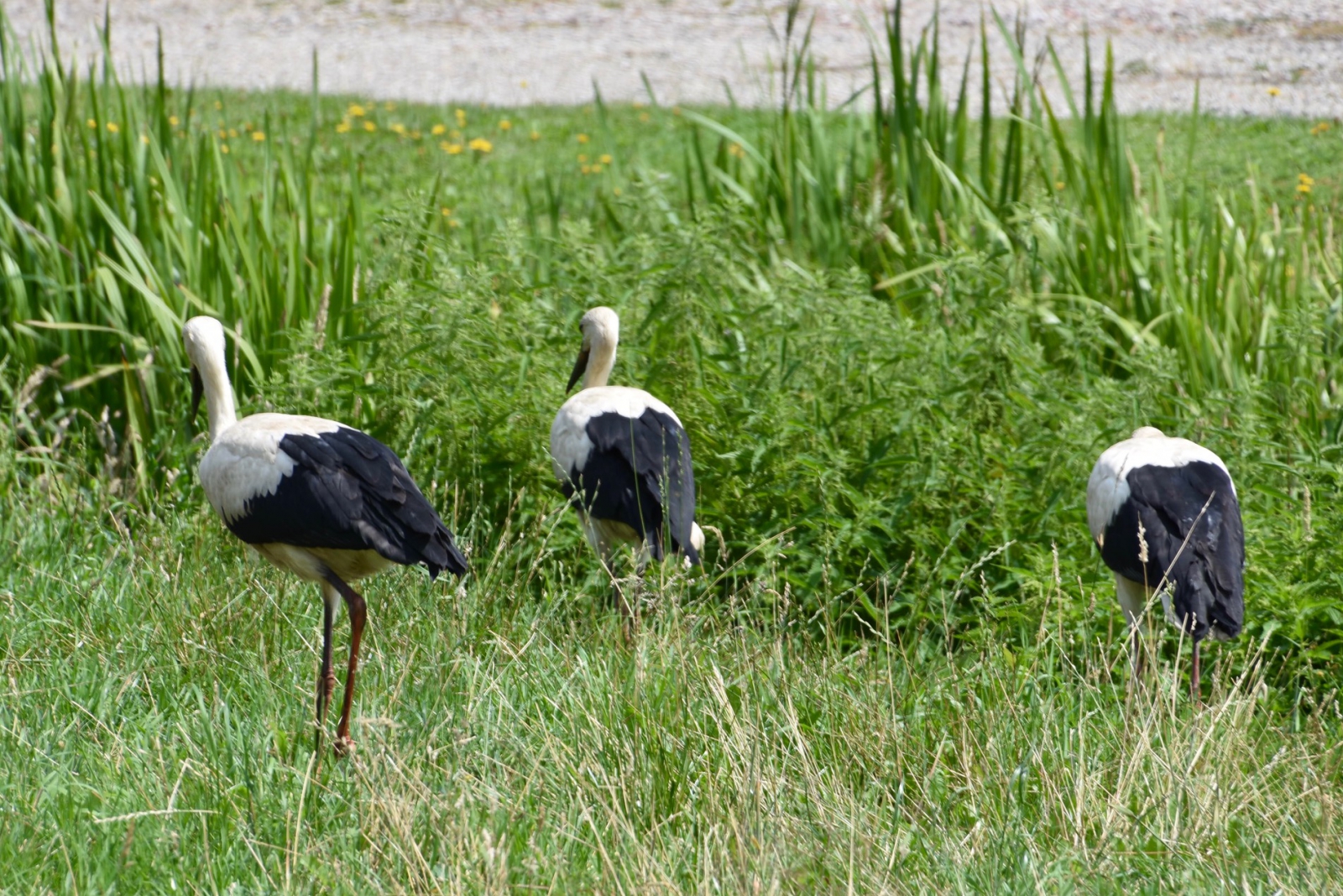 Twee ouders en drie jonge ooievaars liepen in een weiland