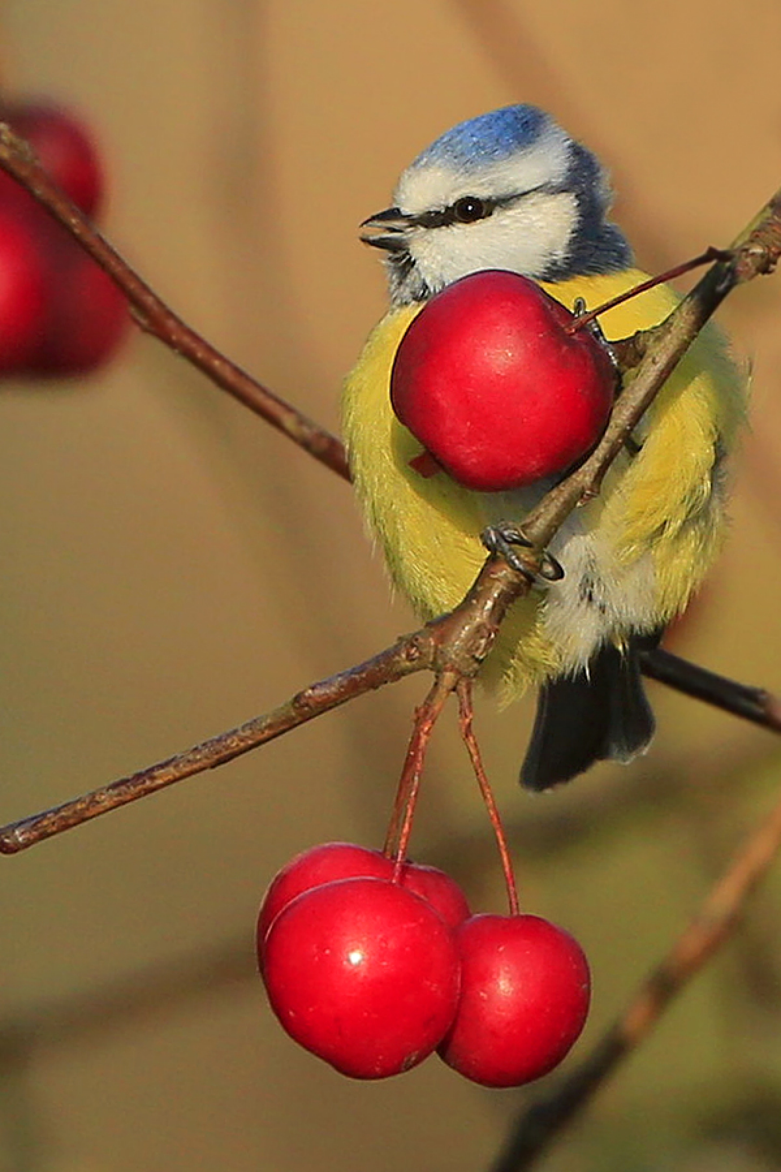 Who's afraid of red, yellow and blue ? Het Pimpelmeesje steekt mooi af bij de rode malusappeltjes ... Parus caeruleus - Blaumieske - PIMPELMEES - Blue Tit - Blaumeise - Mésange bleue