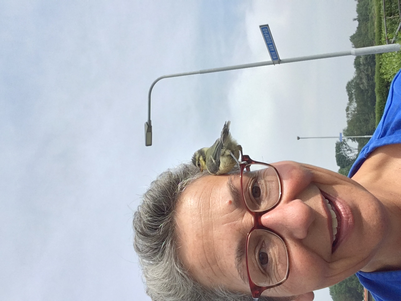Jong pimpelmeesje vliegt uit en landt op bril. Heemskerkerduin 1 juni