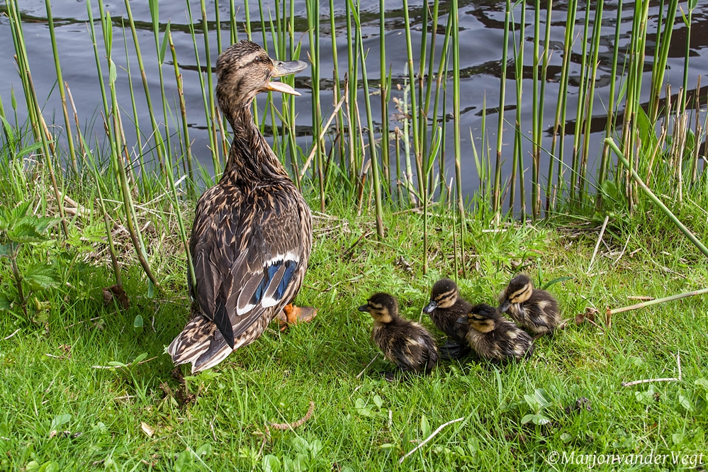 Gisteren fietste ik naar de vijver, en aanschouwde hoe Mister Nijlgans kleine eendjes probeerde te verdrinken, en moeder eend wilde hij ook een kopje kleiner maken. Ik racede zo snel ik kon naar die kant van 't water, en vroeg aan 'm offie GEK geworden was, en joeg de Lullo weg, toen moedereend luid kwakend op de kant probeerde te komen, kwam er een mannetjes eend aan die wilde wel ff een wippie maken op moedereend, ik had zoiets van HALLO jongeman, waar zijn wij nou helemaal mee bezig, zie je dan niet wat jouw soortgenoot net aan ontsnapt is? Moedereend krabbelde op de kant, maar 't ventje eend, of geile duck, bleef haar maar bijten, en op haar willen duiken, ook hem joeg ik weg, OPZOUTEN !!! De vier kleine hommeltjes zaten helemaal beduusd op de kant, en moeder eend kwaakte luid. De bruten. Van moeders moet je afblijven !!! En helemaal als ik in de buurt ben, dus red Moeder eend van al die geile eenden, en Moordende Nijlganzen !!!