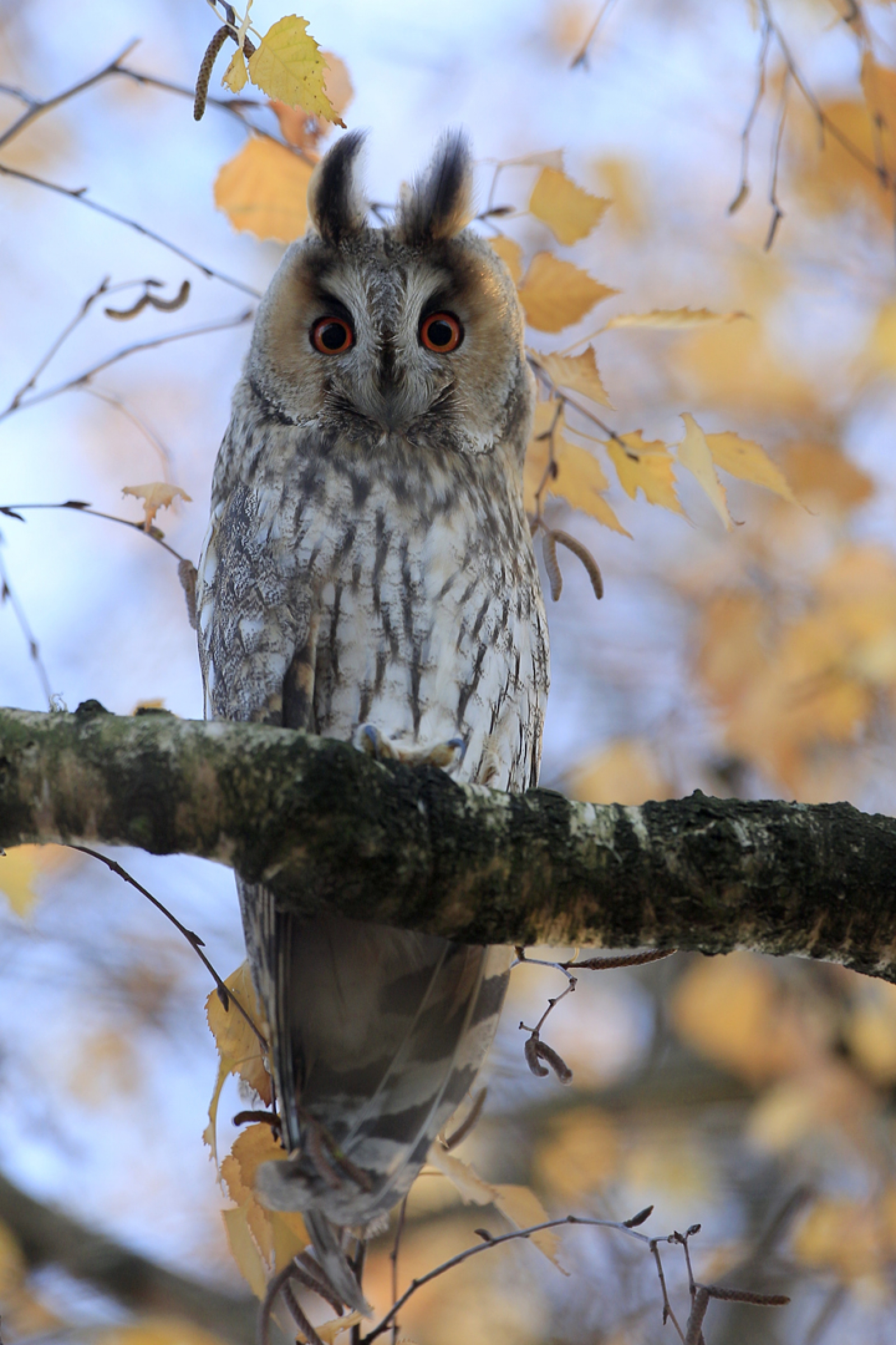 Een Ransuil kijkt ons hypnotiserend aan. Gezeten op een berkentak en omringd door herfsttinten ...