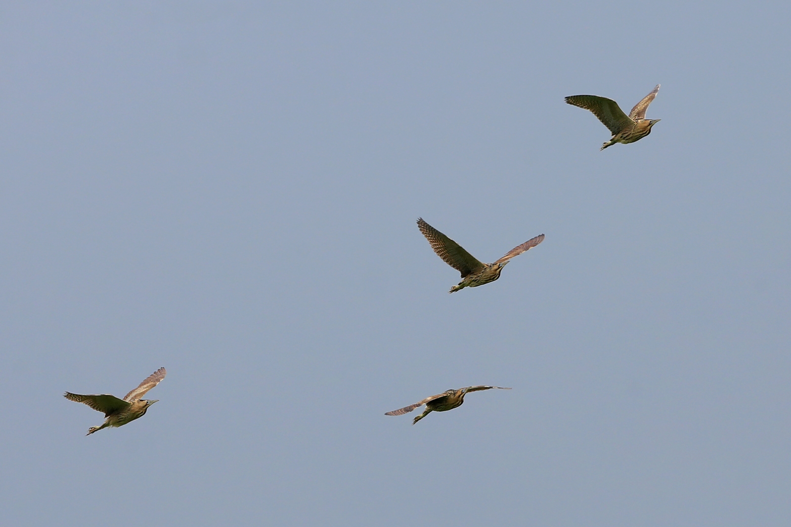 Vier Roerdompen Gisteren had ik even last van bruisende adrenaline toen er vier Roerdompen overvlogen ... Botaurus stellaris - Reiddomp - ROERDOMP - Bittern - Rohrdommel - Butor étoilé - Tarabuso