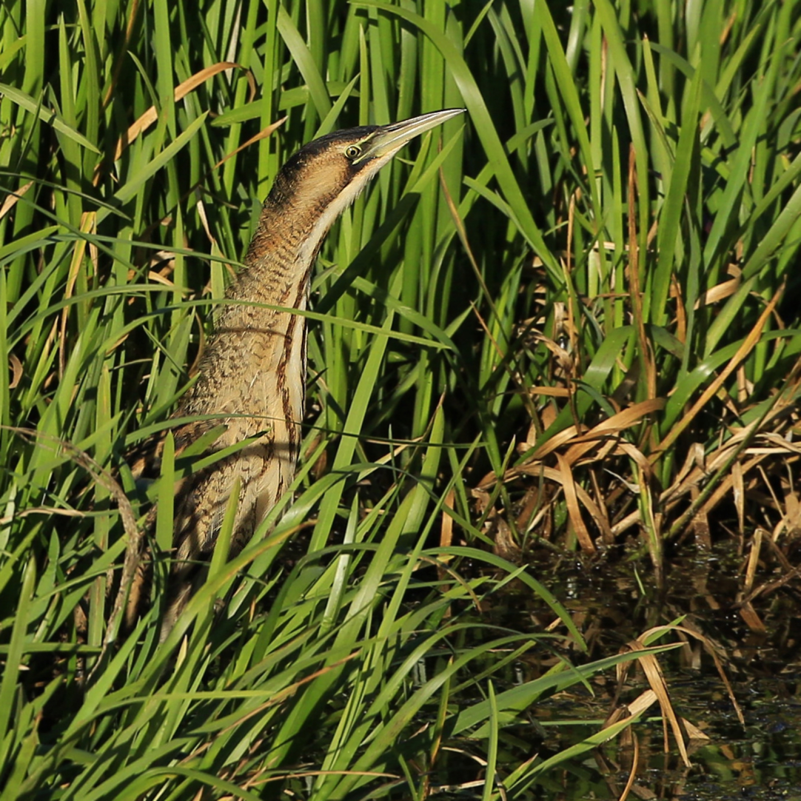 Aandachtig tuurt de Roerdomp in het water zoals een visser gebiologeerd naar zijn dobber kijkt...