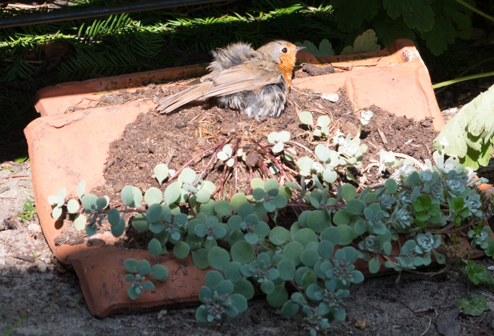 Dit vogeltje bezoekt vaak onze tuin. Het is een verfomfaaid roodborstje. Ik weet niet wat hiermee aan de hand is; waarschijnlijk is het een jonge vogel "in de rui"? Maar hij/zij heeft het, zo te zien, goed naar de zin.