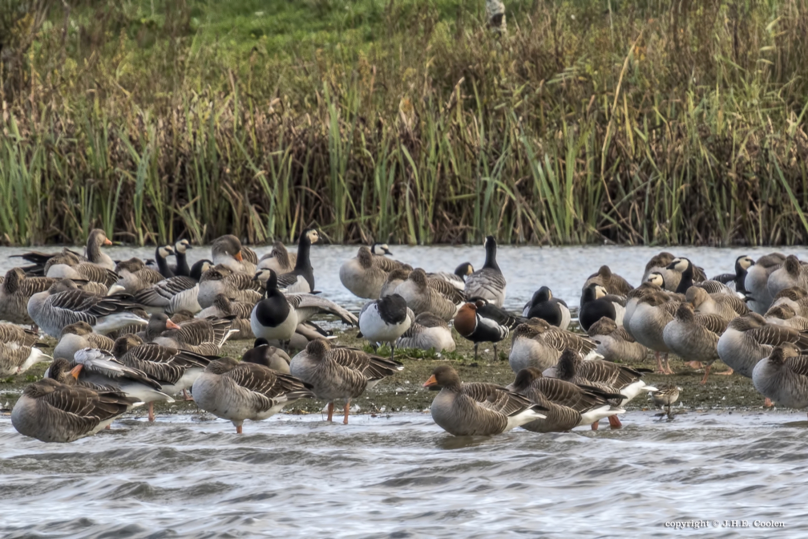 Verborgen tussen brandganzen en grauwe ganzen zat deze kleine wintergast verborgen, na lang wachten eindelijk een beetje vrij van de andere ganzen, op grote afstand genomen, maar omdat ze haast niet te zien zijn, toch geplaatst. Roodhalsganzen zijn in Europa alleen in de winter waar te nemen. De broedgebieden liggen op de koude Midden-Siberische toendra's. De vogels vertrekken eind september en overwinteren rond de Zwarte Zee, Kaspische zee en het Oeralmeer. In Europa bevinden de grootste concentraties zich in Roemenië en Bulgarije. In Nederland is de roodhalsgans een vrij zeldzame wintergast: van het kleine deel van de roodhalsganzen dat doorvliegt naar West-Europa belandt slechts enkele vogels in Nederland.