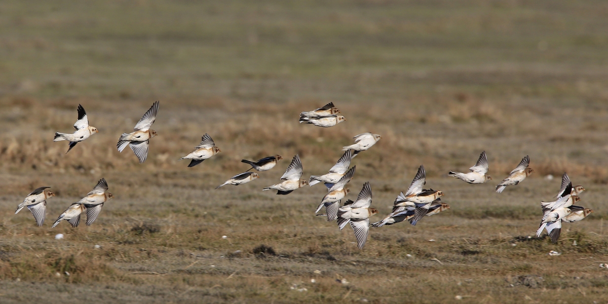 Een vlucht Sneeuwgorzen aan de Friese Waddenkust ...