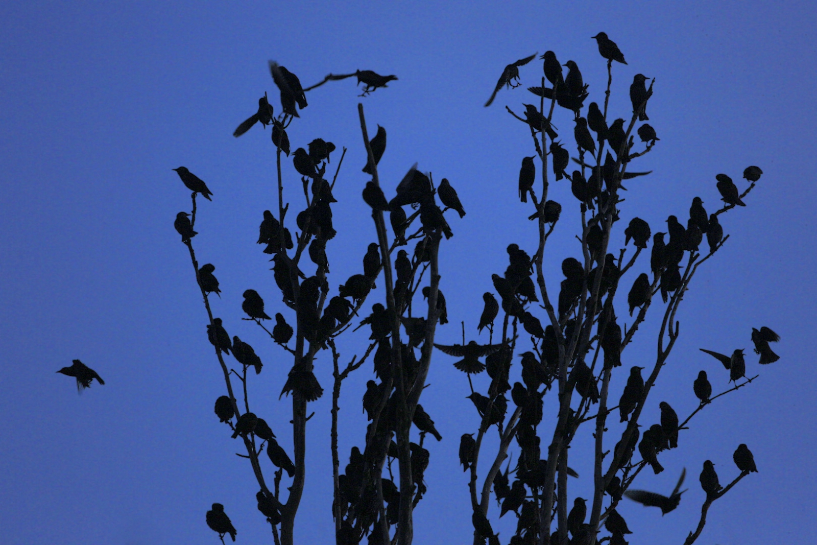Het is weer de tijd van de spreeuwenzwermen ... Altijd weer indrukwekkend om te zien en te horen. Hier een aardige silhouettenverzameling in de toppen van een boom...