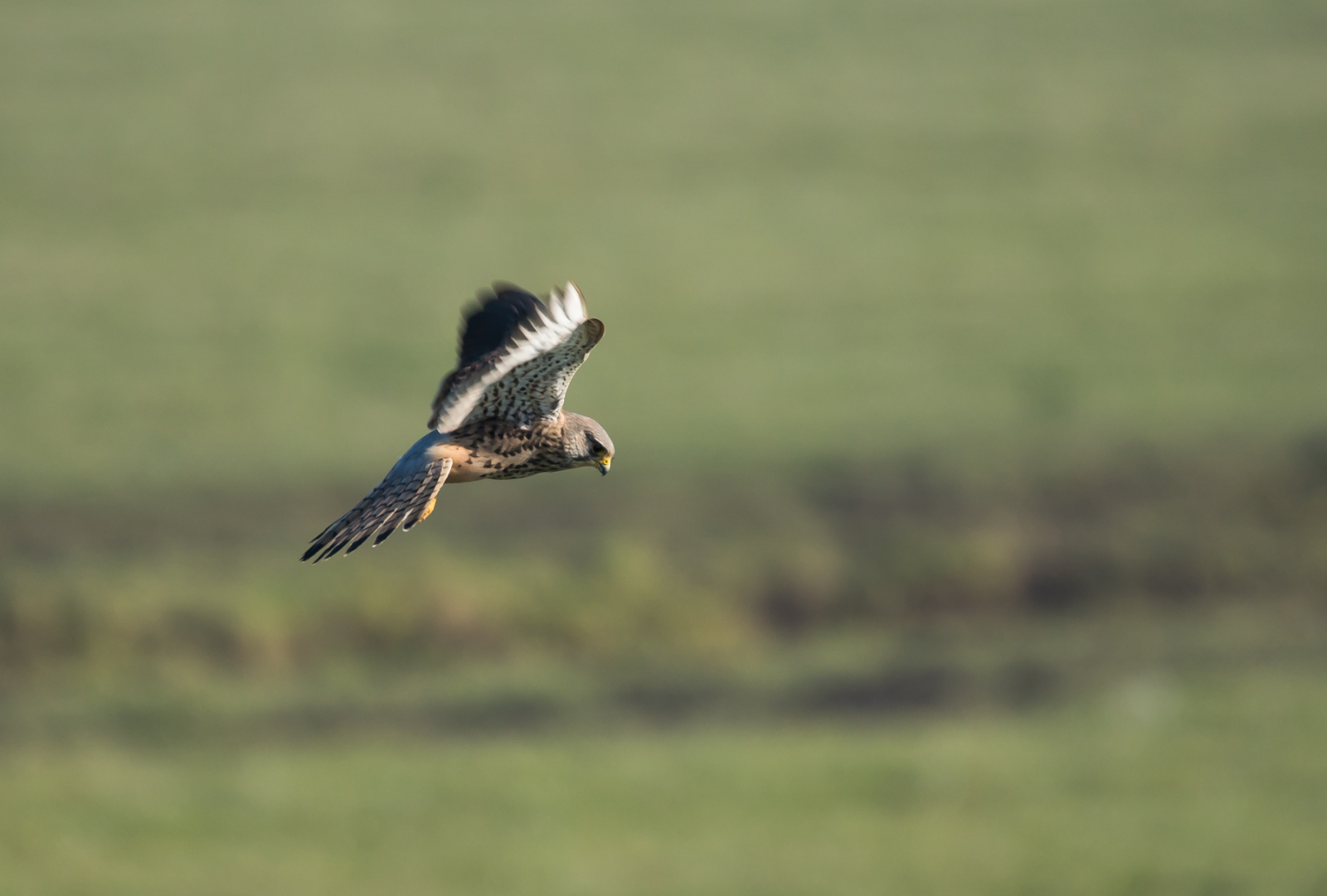 Torenvalk aan het bidden boven een weiland op zoek naar hapje.