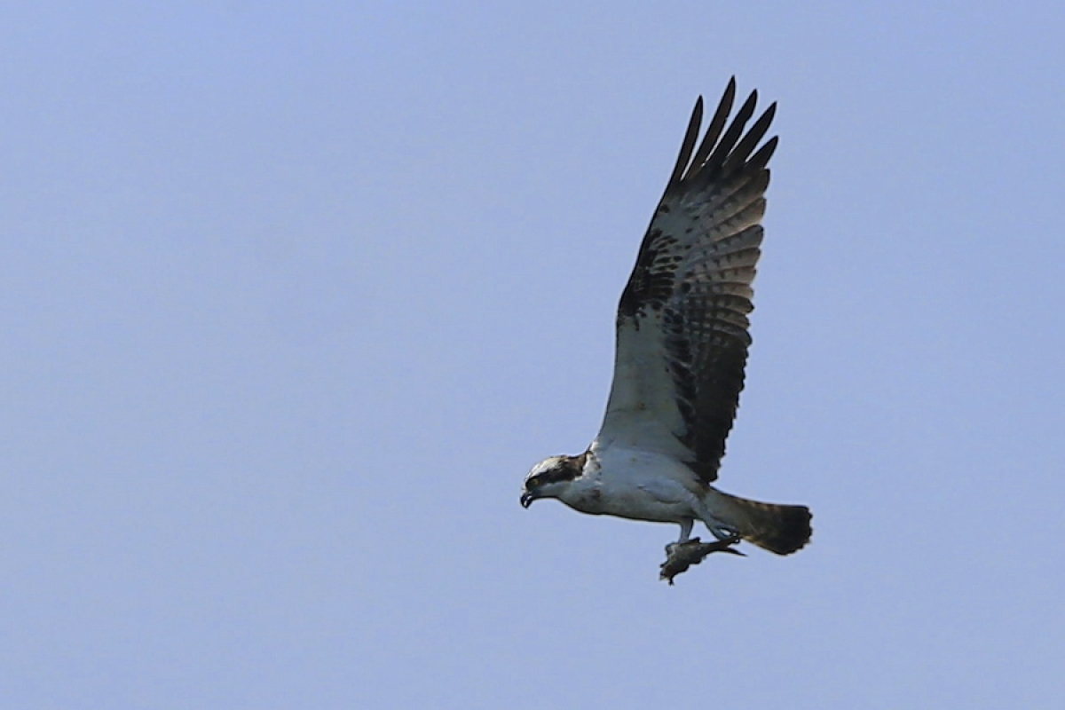 Mijn eerste Visarend van dit jaar. Hoewel ik er wel betere foto's van gemaakt heb wil ik dit moment hier toch graag even delen. Wonderlijk: In een paar gesprekken kwam hij al aan de orde vandaag en jawel, opeens vloog hij over en ook nog eens met (halve) prooi ! Hij/het 'hing zogezegd al in de lucht'... :-)