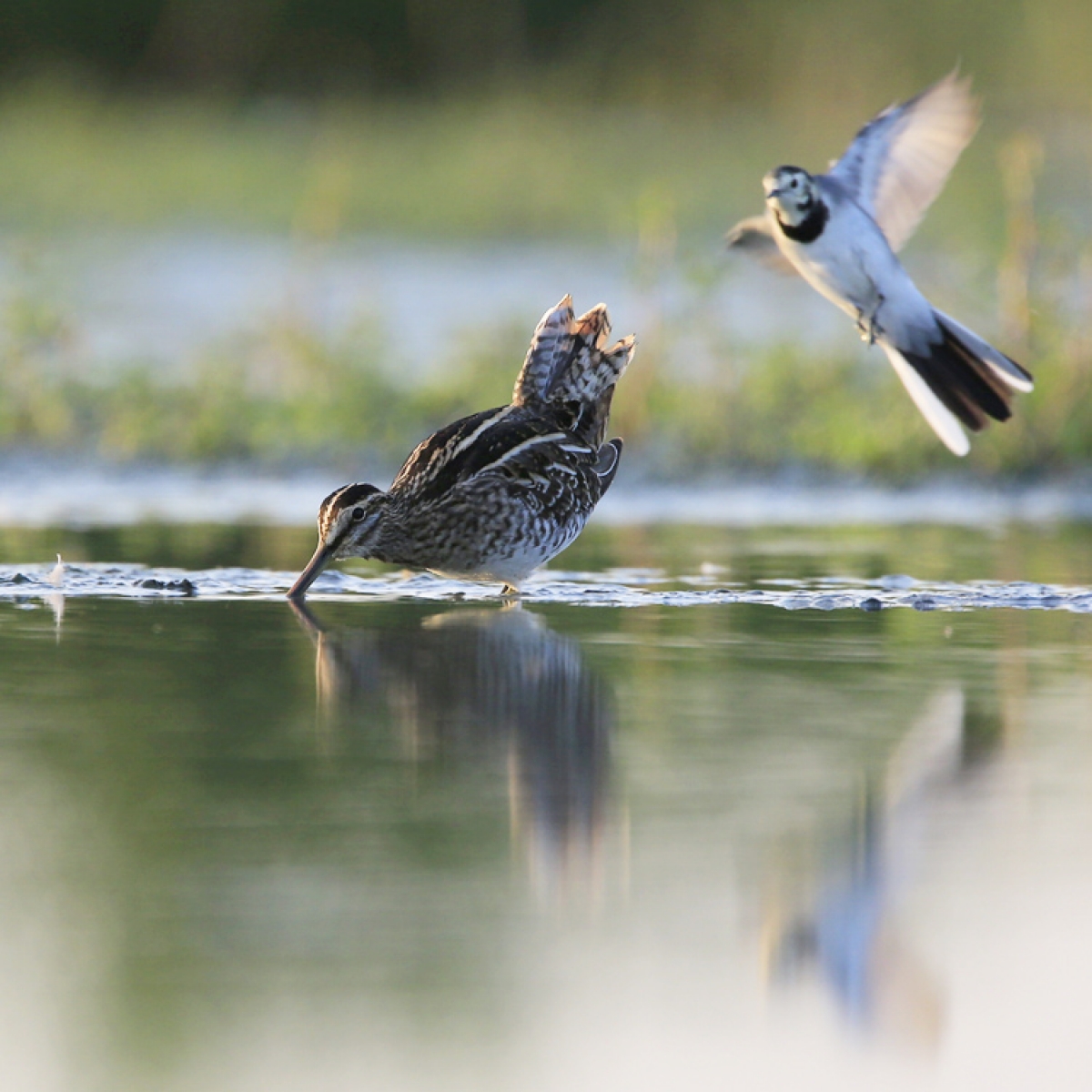 Een foeragerende Watersnip schrikt even van een overvliegende Witte Kwikstaart... :-)