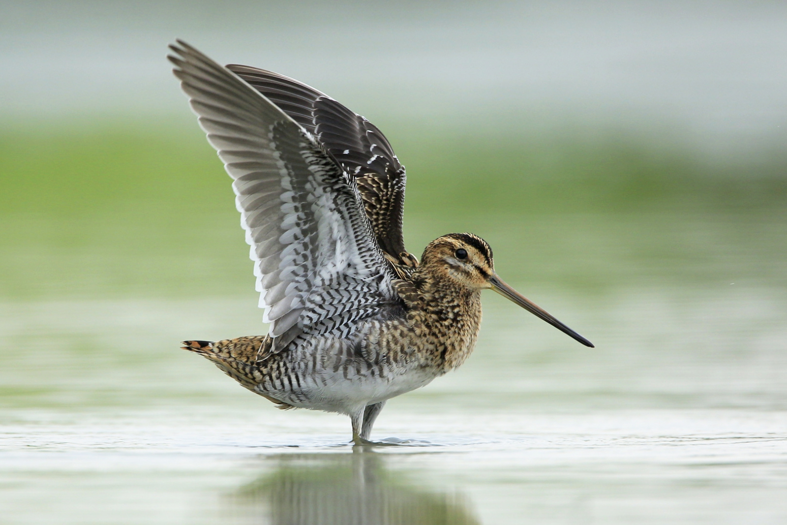 Een Watersnip laat even zijn veerkrachtige verenpracht zien...