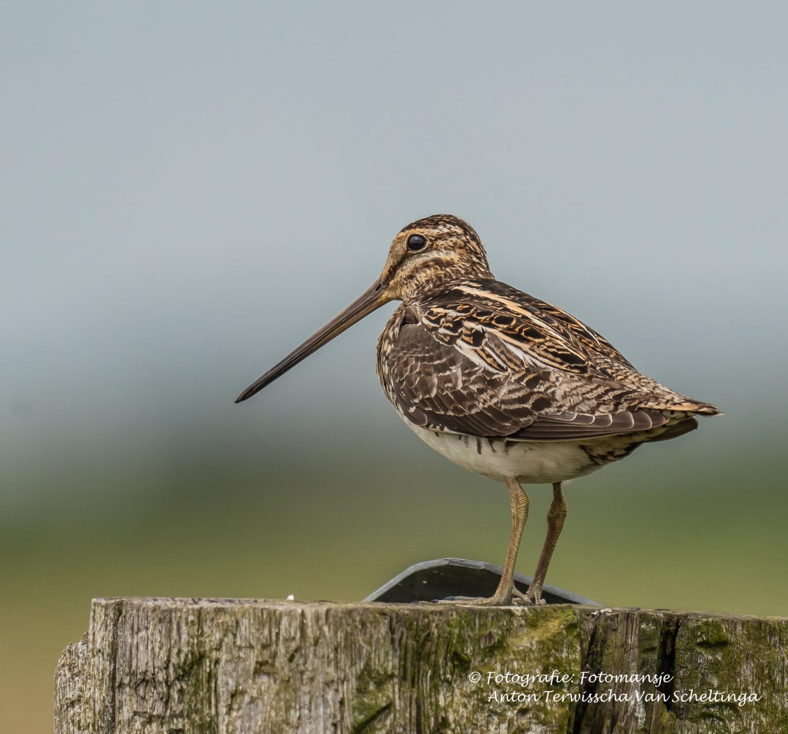 Wanneer verwacht je nu een Watersnip op een paal midden in het weiland. Nou ik niet en vindt het dan ook apart. Toch bleef deze Watersnip mooi poseren voor de foto, keek soms wat onrustig om zich heen wanneer een roofvogel zich even liet zien. Deze Watersnip zat aan de rand van de Alde Feanen.