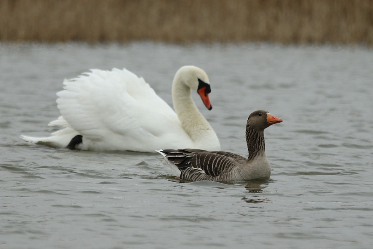 Grauwe gans dobberde wat in grote plas en kwam ongemerkt in de buurt van de knobbelzwaan [m] die dit niet op prijs stelde….