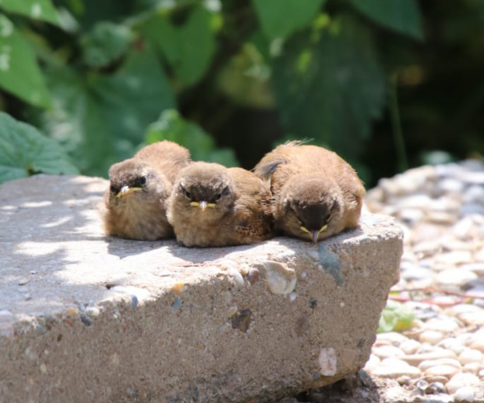 3 jonge Winterkoninkjes zijn zich aan het opwarmen op deze tegel, voorjaar.