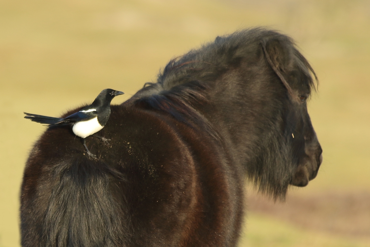 groepje eksters bleven in de buurt van de ponny's