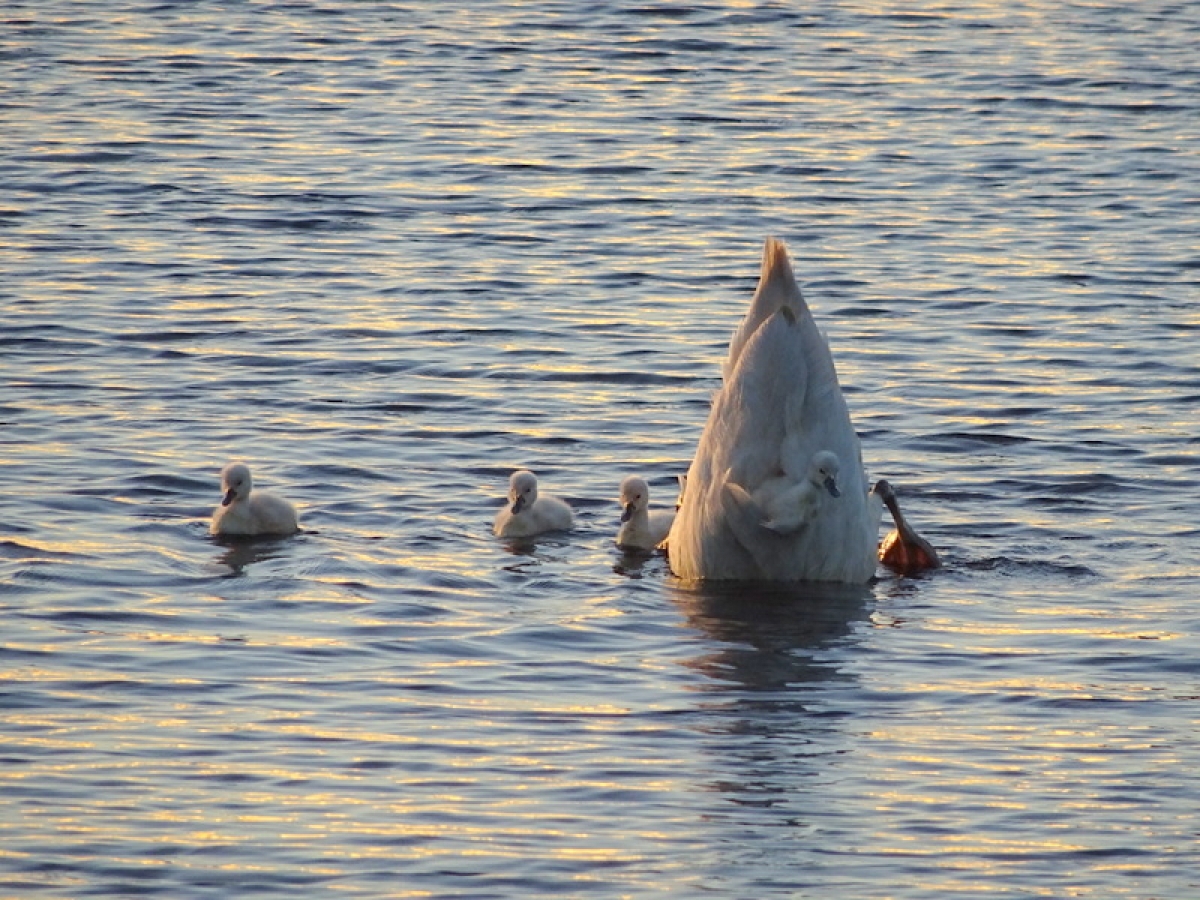 Jonge zwaam zit op moeders rug. Moeder gaat grondelen en het kuiken "hangt" op haar rug mee.
