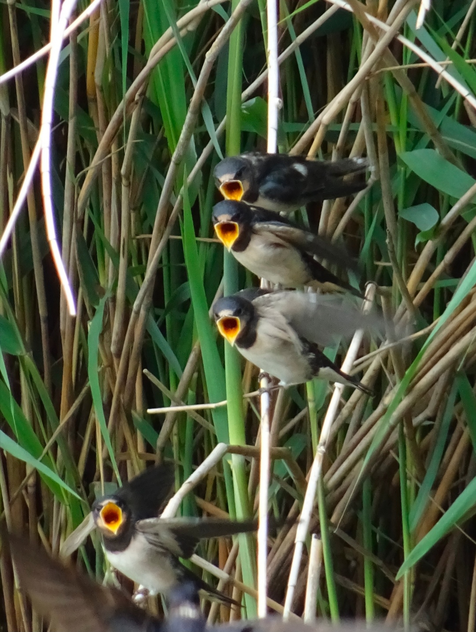 Terwijl ik zocht naar een ijsvogeltje dat er ergens een nest zou hebben ontdekte ik in het riet deze 4 zwaluwtjes, wachtend op een lekker hapje.