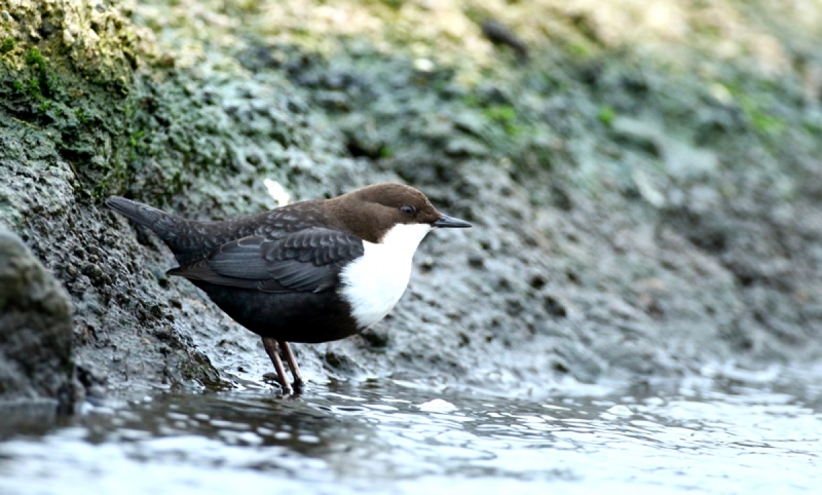 De zwartbuikwaterspreeuw foeragerend bij stuwjes in Warnsveld .