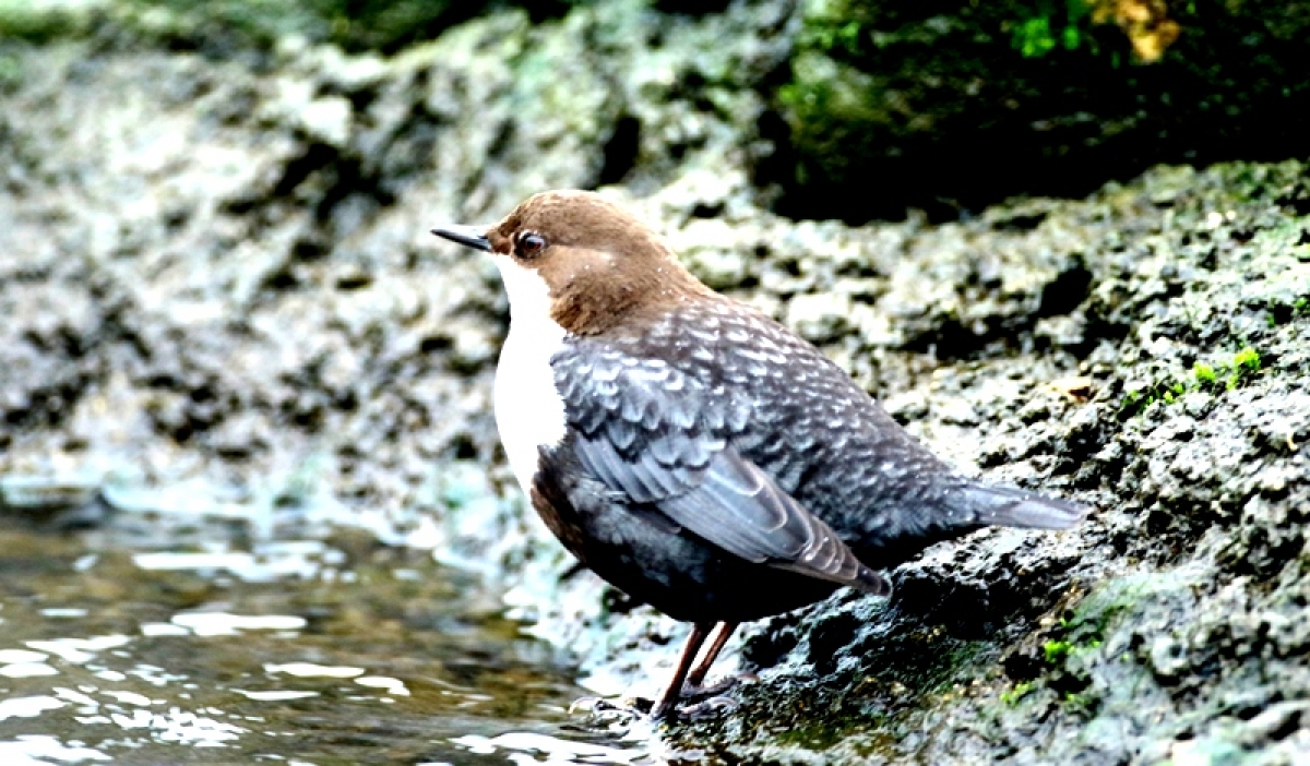 De zwartbuikwaterspreeuw foeragerend bij stuwjes in Warnsveld .