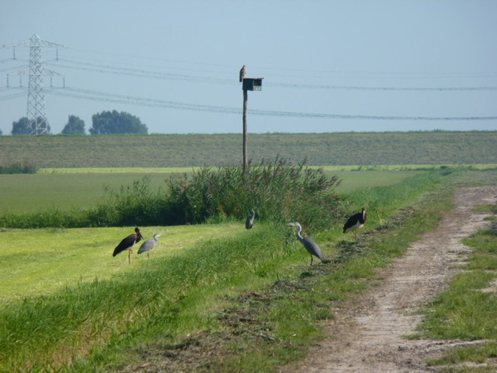 Al enkele dagen werden er twee zwarte ooievaars op ons land waargenomen. Tot ik woensdag 2 sept dit hele gezelschap voor de lens kreeg. Een mooi schouwspel. 2 zwarte ooievaars met drie reigers onder het toeziend oog van een buizerd