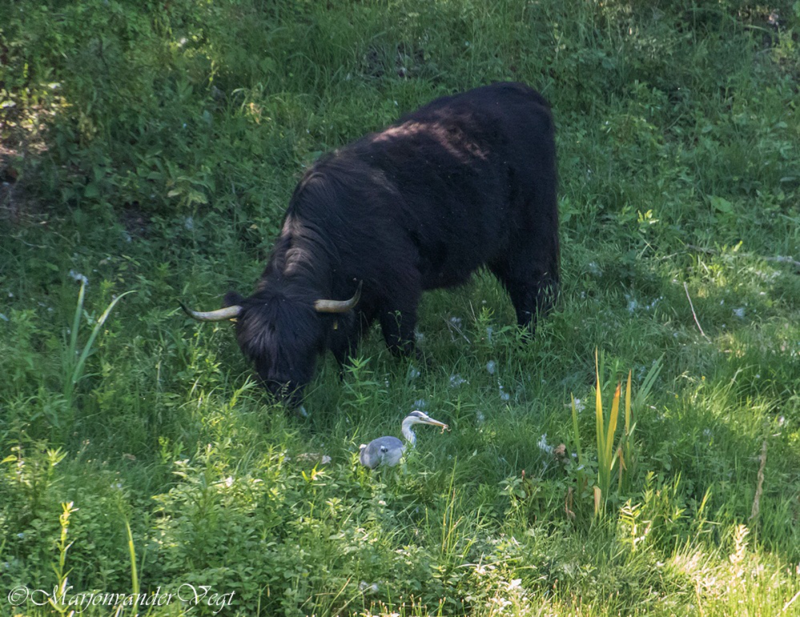 Ja toch? Die reiger was zo niet bang voor de Hooglander, en die sul was alleen maar gras aan 't eten dus... leuk te zien zo , en de kikker was bonus!
