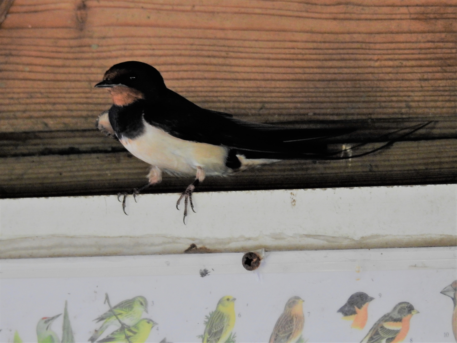 Boerenzwaluw boven op een infopaneel in een vogelkijkhut. Bleef rustig zitten.