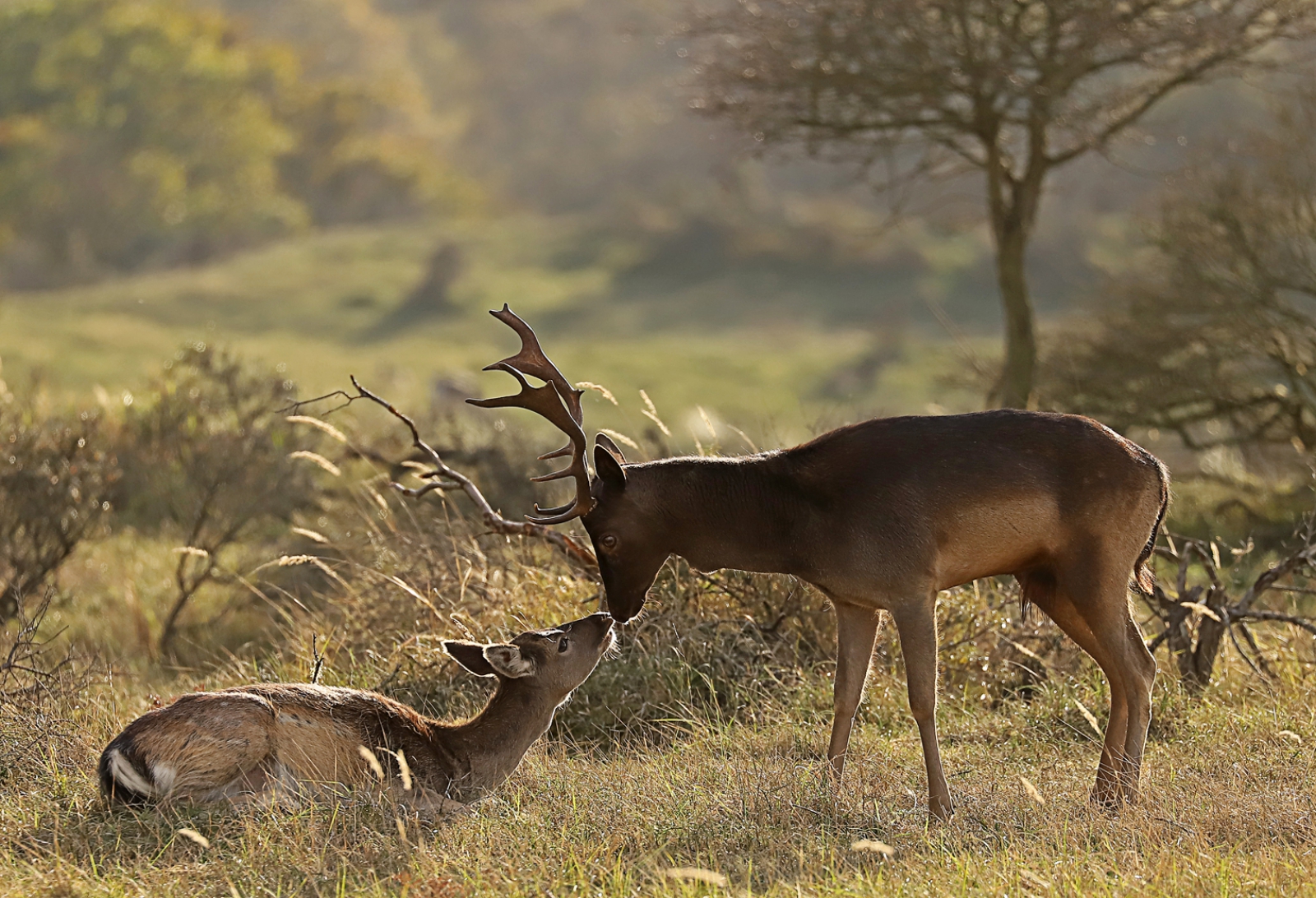 Deze foto is gemaakt in de Amsterdamse Waterleidingduinen tijdens de bronsttijd. Te midden van de heftige gevechten gebeurde dit, een prachtig bronst ritueel. Deze damherten hadden alleen maar aandacht voor elkaar. Ontroerend om het te mogen zien en vastleggen.