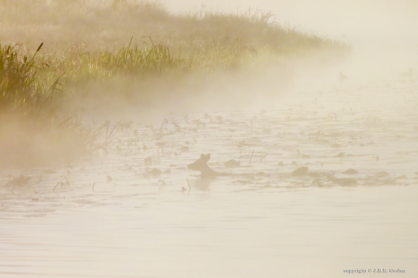 Onder dekking van de laag hangende mist, zwom deze ree de Raam over. Gr. Jan