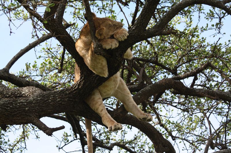 Deze slapende leeuw is gefotografeerd tijdens onze safaritrip in de Serengeti. Hij, en zijn broers en zussen, hadden net een prooi opgegeten en lagen heerlijk in de bomen te slapen.