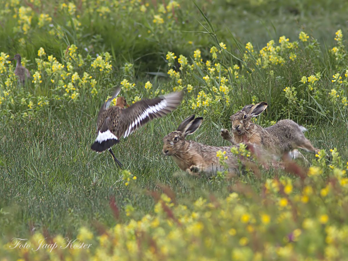 Ben ik druk bezig een grutto te fotograferen, zie ik ineens twee hazen door het broedgebied van de grutto's sprinten.