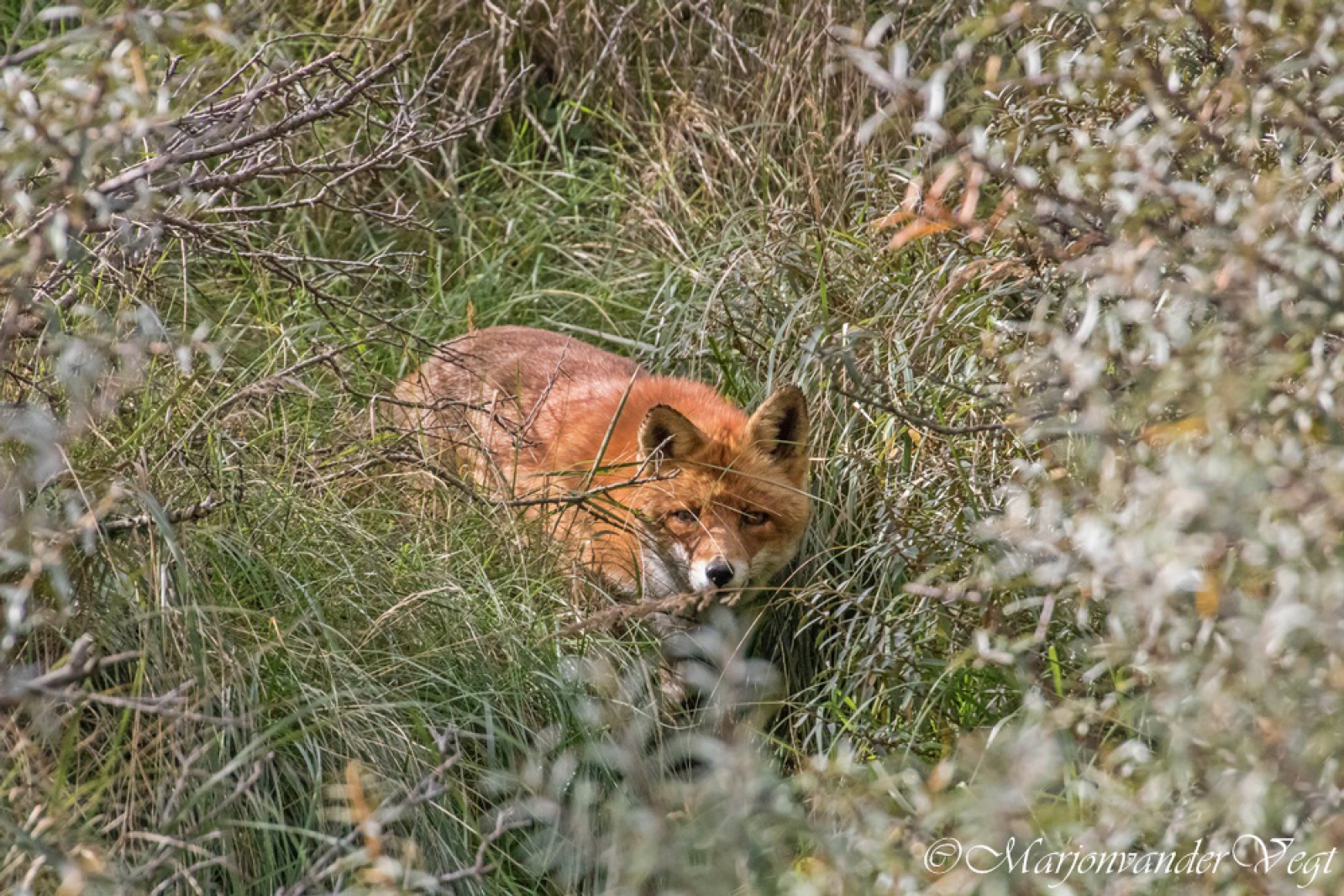 Mooie foto van een vos met wat kiekeboe effect! Gefeliciteerd met de mooiste!
